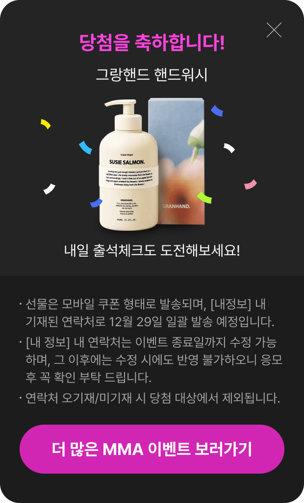 내일의 선물 경품 1. MMA2025 초대권 (1인 1매)<br>경품 2. 그랑핸드 핸드워시