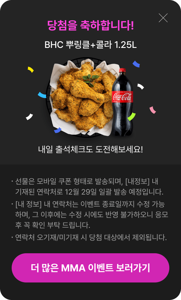 내일의 선물 경품 1. MMA2025 초대권 (1인 1매)<br> 경품 2. BHC 뿌링클+콜라 1.25L