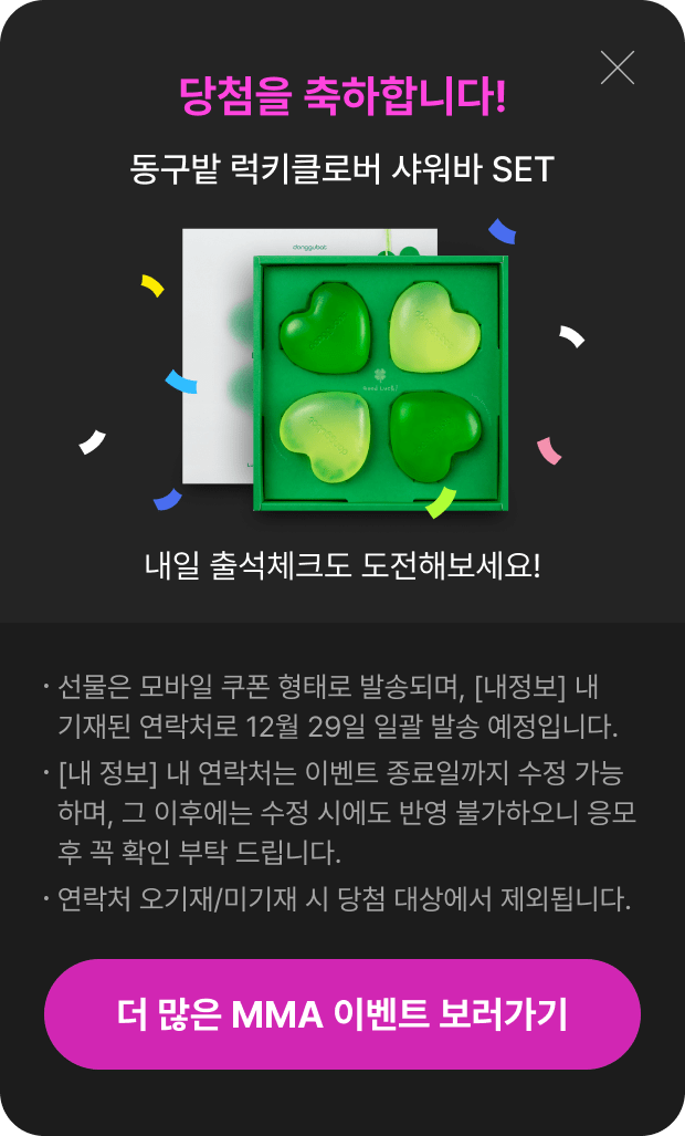 경품 1. MMA2025 초대권 (1인 1매)<br>경품 2. 동구밭 럭키클로버 샤워바 SET