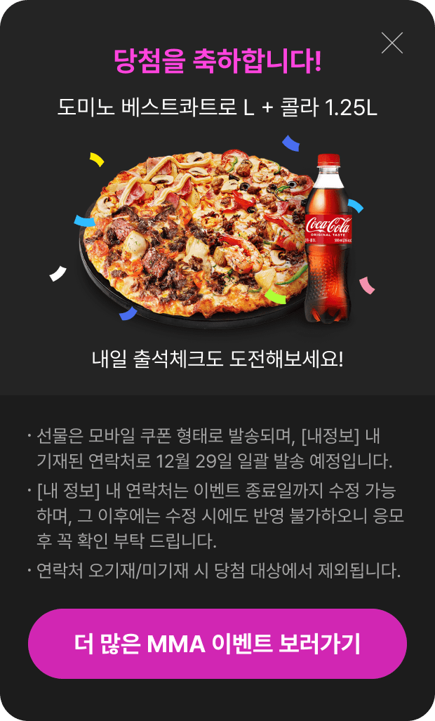 내일의 선물 경품 1. MMA2025 초대권 (1인 1매)<br>경품 2. 도미노 베스트콰트로 L + 콜라 1.25L