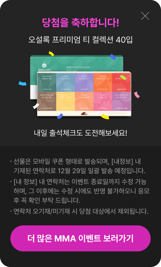 경품 1. MMA2025 초대권 (1인 1매)<br>경품 2. 오설록 프리미엄 티 컬렉션 40입