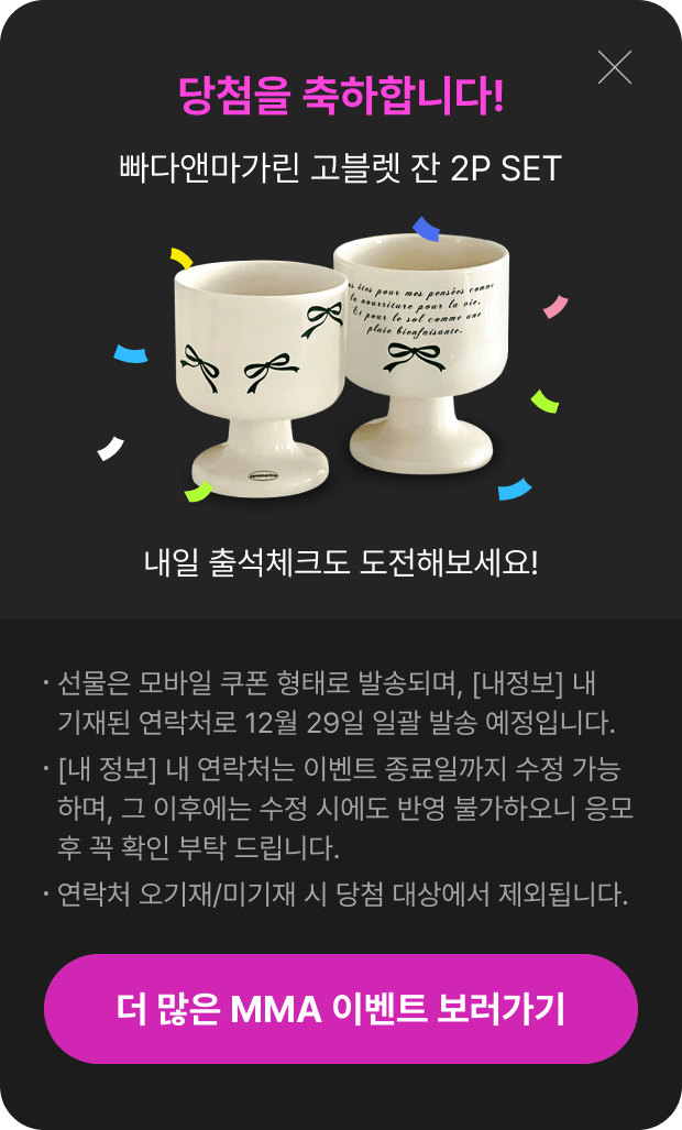 경품 1. MMA2025 초대권 (1인 1매)<br>경품 2. 빠다앤마가린 고블렛 잔 2P SET
