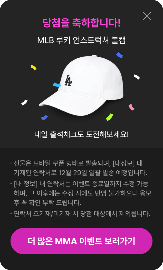 내일의 선물 경품 1. MMA2025 초대권 (1인 1매)<br>경품 2. MLB 루키 언스트럭쳐 볼캡