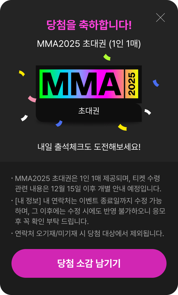- MMA2025 초대권은 1인 1매 제공되며, 티켓 수령 관련된 내용은 12월 15일 이후 당첨자 개별 안내 드릴 예정입니다.